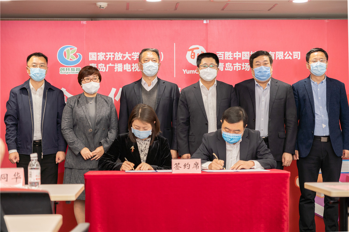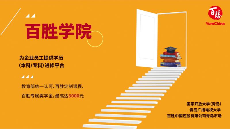 国家开放大学是国家教育部直属的重点大学,实施远程开放教育的新型高等学校。青岛广播电视大学是首批成立的国家开放大学分部,基于其学校办学体系及“互联网 +大学”的优势,百胜中国青岛市场积极探索“学历教育 +职业技能提升 +社会培训”人才培养新模式,与国家开放大学青岛分部携手共建“百胜学院”。 2020年春季首批招生 259人,本科生占比 80%以上。结合百胜中国青岛市场的人才需求特点,将员工的学历教育、岗位训练、职业培训三维度结合,搭建学历提升和非学历继续教育的平台,助力员工实现职业梦想。