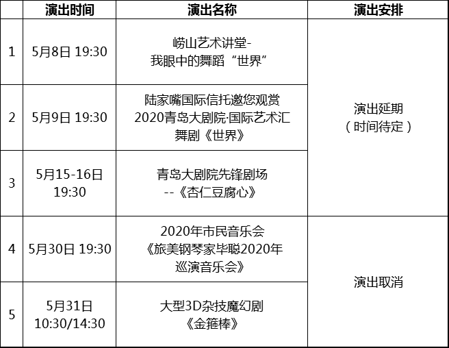 根据行业上级关于新型冠状病毒感染肺炎疫情防控工作的部署及疫情防控最新情况,为切实保障人民群众身体健康和生命安全,经慎重研究并与演出各主办方协商,现对原定于5月份举办的5个项目7场演出进行调整。