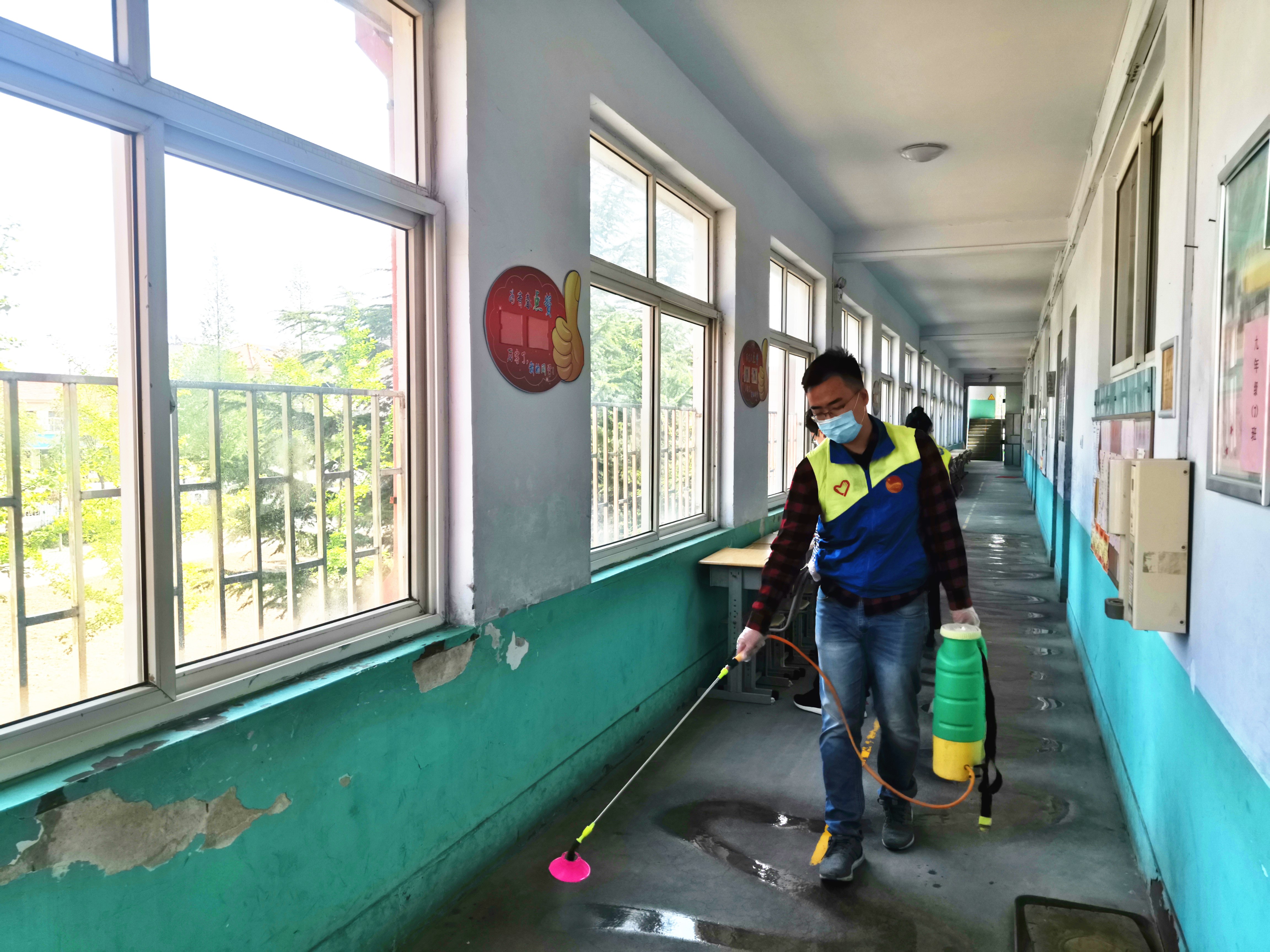 “我们两人一组,先把课桌椅子擦干净了,再喷洒消毒水,把教室窗户、地面全部弄干净了,再接着走廊消毒”。4月30日上午9点,在七级中学教室里,移风店镇团委书记方建兴正在有序安排机关青年团员志愿者开展助力复学志愿行动。