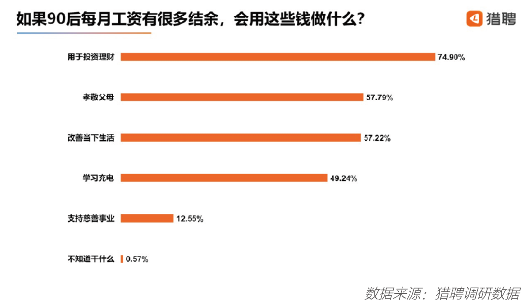 当被问及“如果你每月工资有很多结余,你会用这些钱做什么?”时,有 74.9%的受访者选择了“用于投资理财”,这意味着, 90后普遍有理财习惯,他们一方面享受着超前的消费,一方面也兼顾着创造多渠道的收益。
