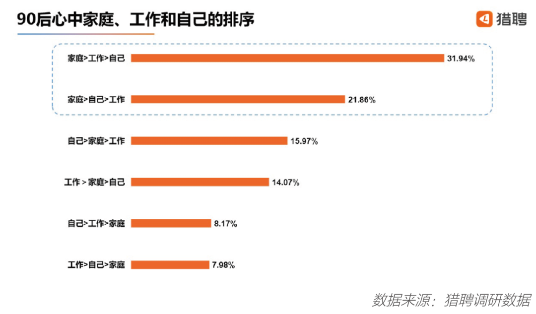 对于 90后而言,家庭在他们人生中占据重要的位置,在关于“家庭”“工作”“自己”三项的排序中,超半数的 90后把家庭放在了首位,其中, 31.94%的 90后的排序为“家庭>工作>自己”; 21.86%的 90后的排序是“家庭>自己>工作”。
