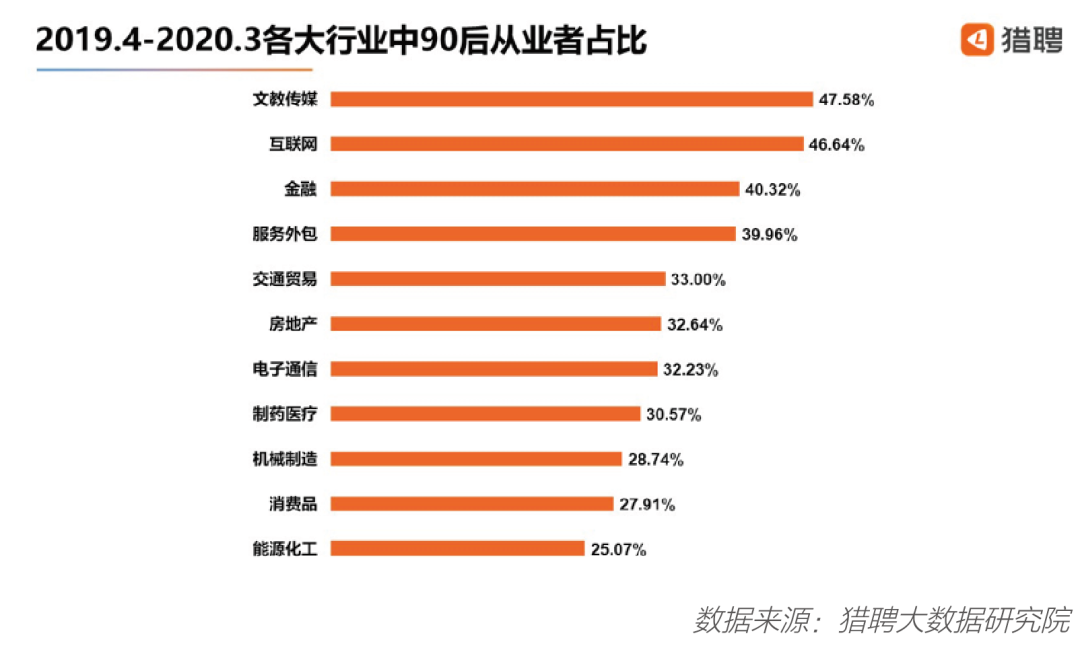 越来越多的 90后人才开始聚集在各行各业中,并且逐渐成为众多行业的中坚力量。猎聘大数据显示,近一年,在文教传媒、互联网和金融三大行业中, 90后从业者占比均超过四成,其占比分别为 47.58%、 46.64%、 40.32%。