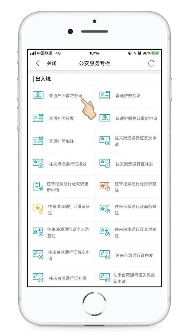 “公安专区”中的6大类便民服务专栏共设有40余项居民常用服务,以“普通护照首次办理”业务为例,进入公安专区后点击下方“出入境”专栏,选择进入该业务: