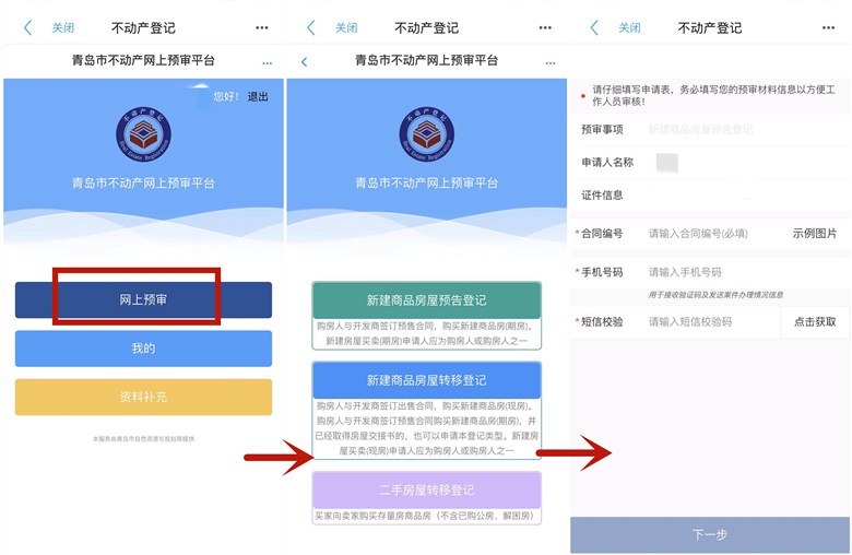 点击“网上预审”,根据需求选择登记类型进入对应预审页面,按提示填报信息即可。