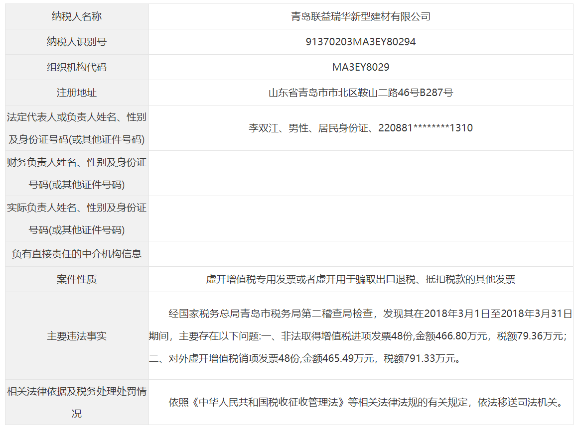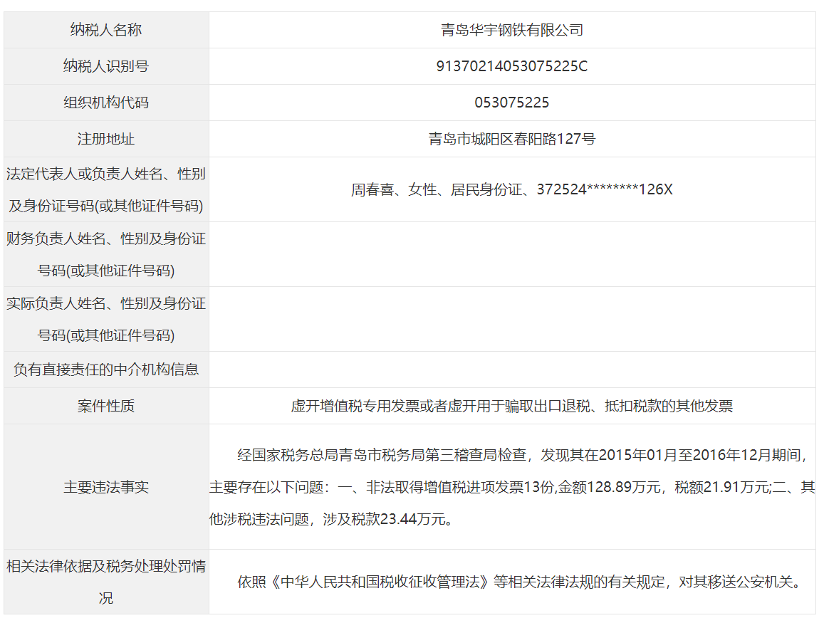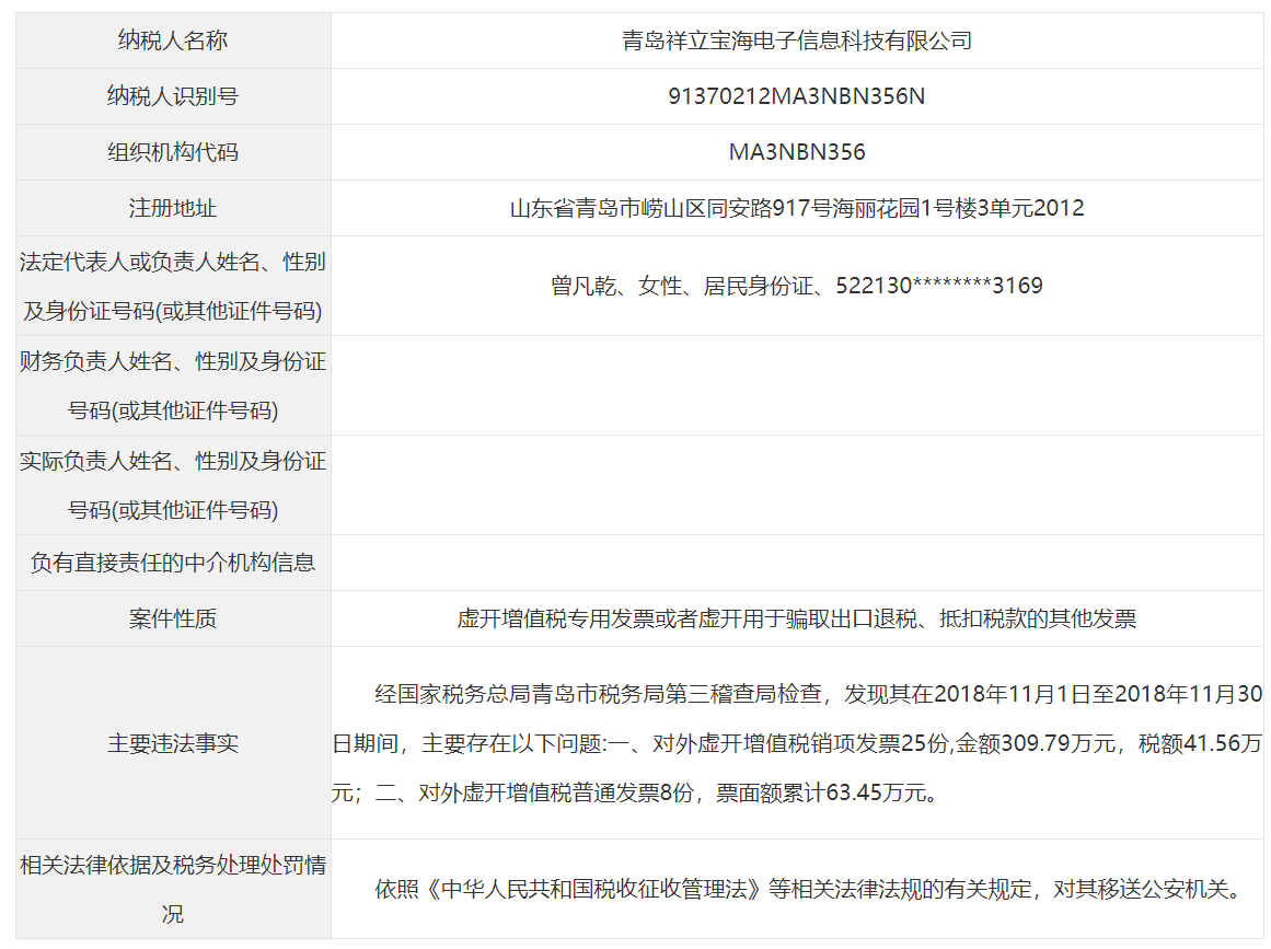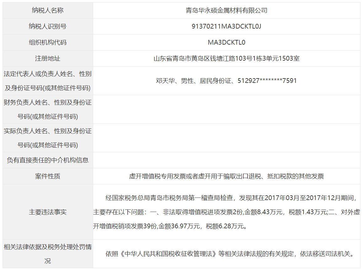 青岛市税务局公告青岛永长鑫泰环保设备有限公司等38起重大税收违法案件