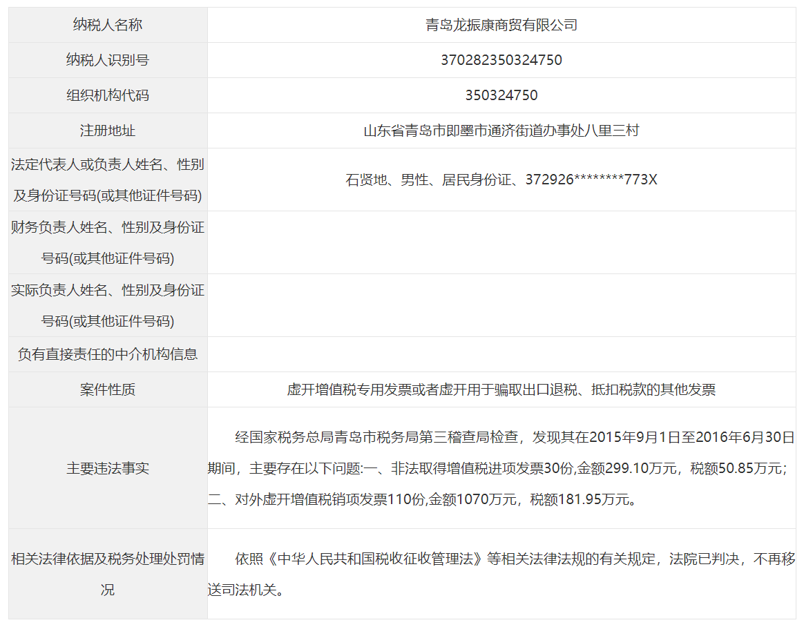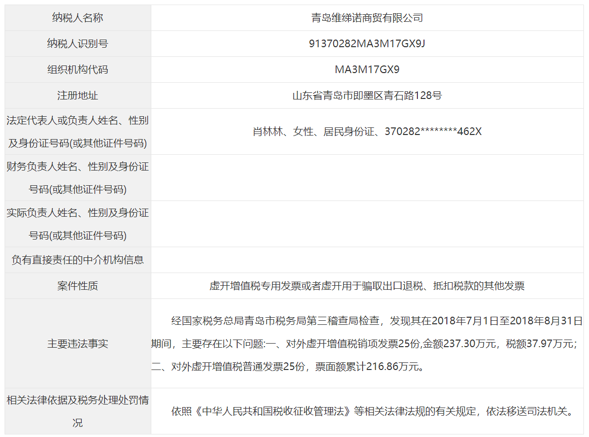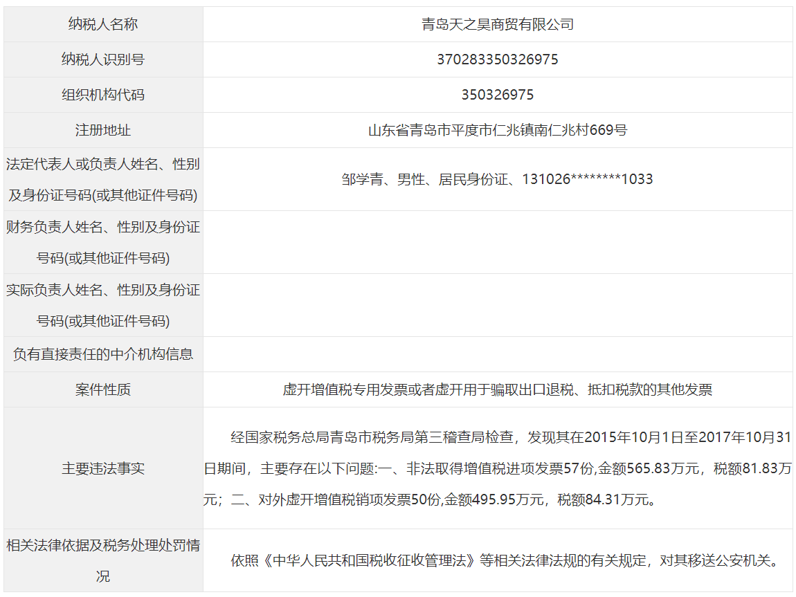青岛市税务局公告青岛永长鑫泰环保设备有限公司等38起重大税收违法案件
