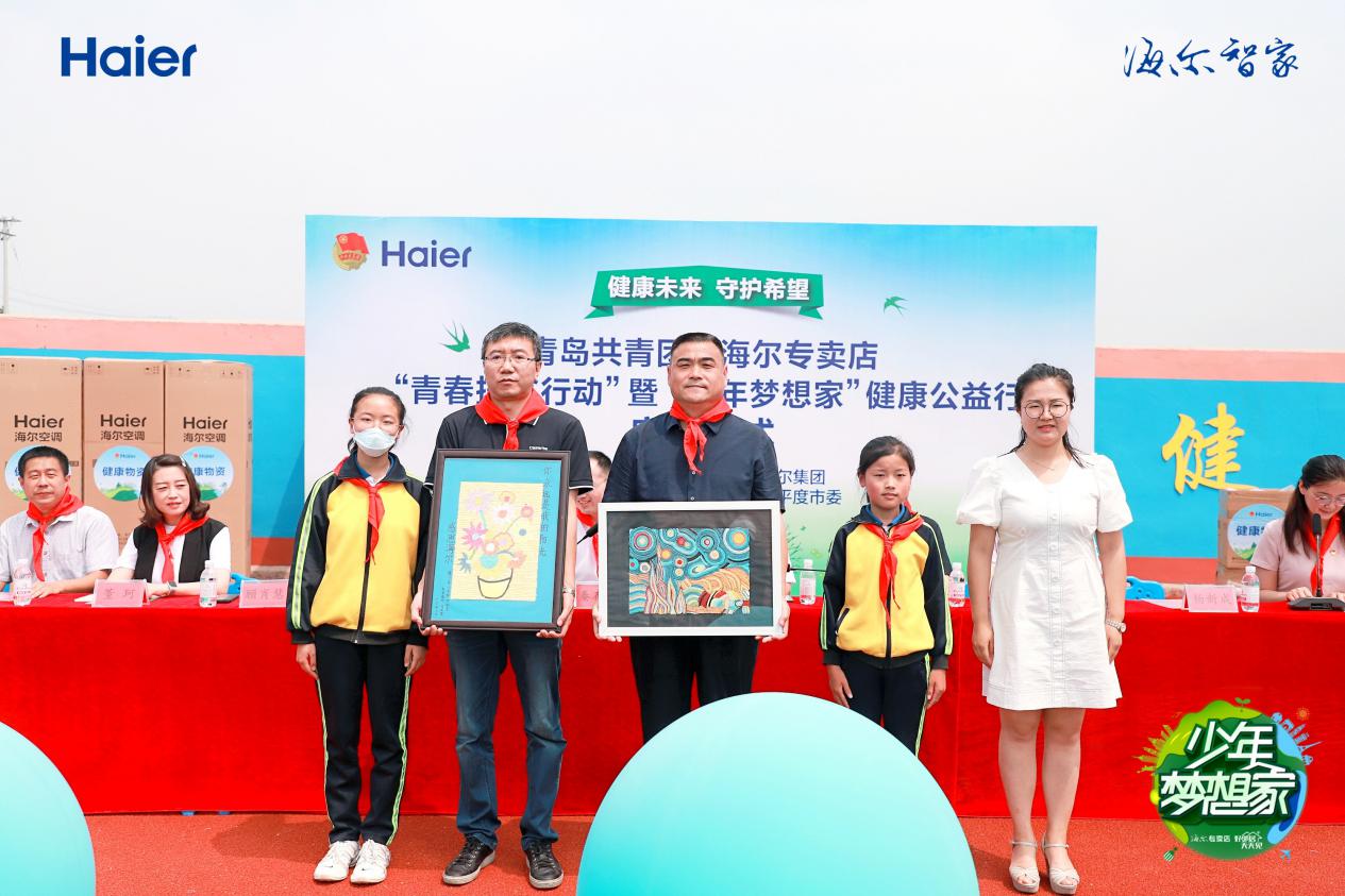 “少年梦想家”健康公益行是海尔专卖店为助力青少年健康成长的公益活动,与青岛共青团“青春扶贫行动”共同守护每一个孩子的梦想。此次活动为学校和孩子们带去了数台柜式抗菌空调、100个健康爱心包和100余套体育器材,既改善了学校的办学条件,又为学生们优化了学习环境和体育活动设施,后期还将为有需求的海尔希望小学提供空调免费清洗服务。孩子们用心创作,将梦想和希望融入画作中献给海尔专卖店,表达对海尔的感恩之情。
