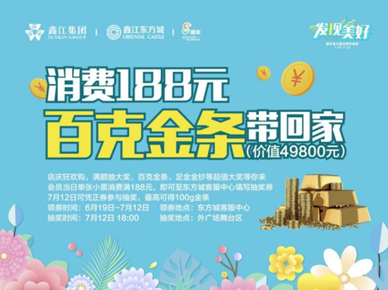 店庆狂欢购,满额抽大奖,6月19日-7月12日,会员凭当日单张小票消费满188元,即可至客服中心填写抽奖券,7月12日可凭正券参与抽奖,最高可得100g金条!还有20g足金金条、10g足金金条等超多黄金大奖哦!