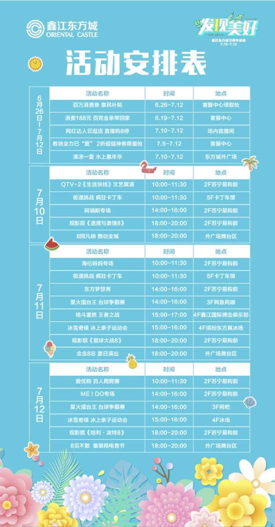 今年鑫江东方城以“发现美好”为主题的8周年庆,将给大家带来哪些“另类”的惊喜呢?7月10日-7月12日鑫江东方城8周年庆里,我们准备了持续72小时的狂欢盛典!硬核福利,空前折扣,钜惠活动,火力全开!
