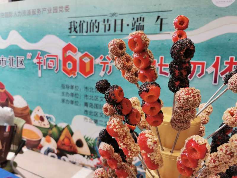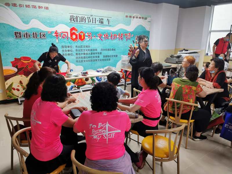 当天中午举办的市北区“我们的节日·端午”暨“午间60分·文化初体验”活动由市北区委宣传部(区文明办)指导、市北区文旅局主办,青岛国际人力资源服务产业园党委、青岛中泰信大厦楼宇党委、嘉善路社区党委、北岭社区党委和市北第二文化馆联合承办。来自产业园和中泰信大厦的近百名白领及社区居民代表相约而至,在老师的指导下,从端午节作为中国传统节日的由来、习俗、特色等几个方面,现场开展专题讲座分享,缝制端午节香包,感受传统节日文化特色。参加活动的人员,还在青岛高家糖球制作技艺第三代传承人高士湘的指导下小试身手,蘸上一串芝麻糖球,分享端午节日带来的体验感、获得感。