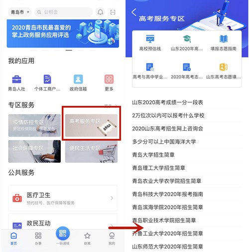 青岛新闻网7月29日讯 为满足我市广大考生对于新高考志愿填报、学校专业学科选择、权威招生信息咨询的需求,近日,“青e办”APP上线高考服务专区,专区聚合2020年高考资讯,为家长和考生提供权威、准确、实时的一站式高考信息服务。用户可以在专区一次性查阅到高考分数线、高校预估线、志愿填报指南和问答及青岛各大高校招生简章等实用内容。“高考服务专区”位于“青e办”APP首页的“专区服务”板块,家长和考生只需点击进入专区详情页,即可查看最新、实用的高考相关资讯。