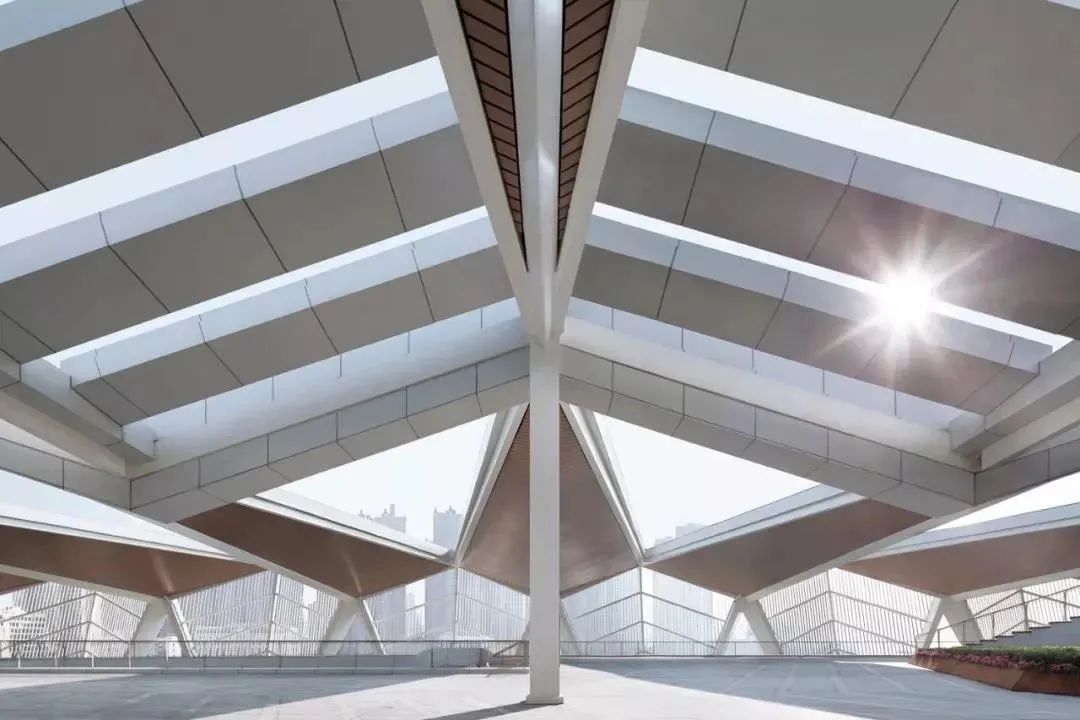 二层的通高空间与室外平台、登船廊桥相连,具有延展性和开放性。通高空间的采光顶,通过铝板与玻璃的结合,将屋顶斜面造型转换成阶梯式的语言,既巧妙地解决了屋面汇水排水的问题,也在韵律感中引入了更为柔和的光线。