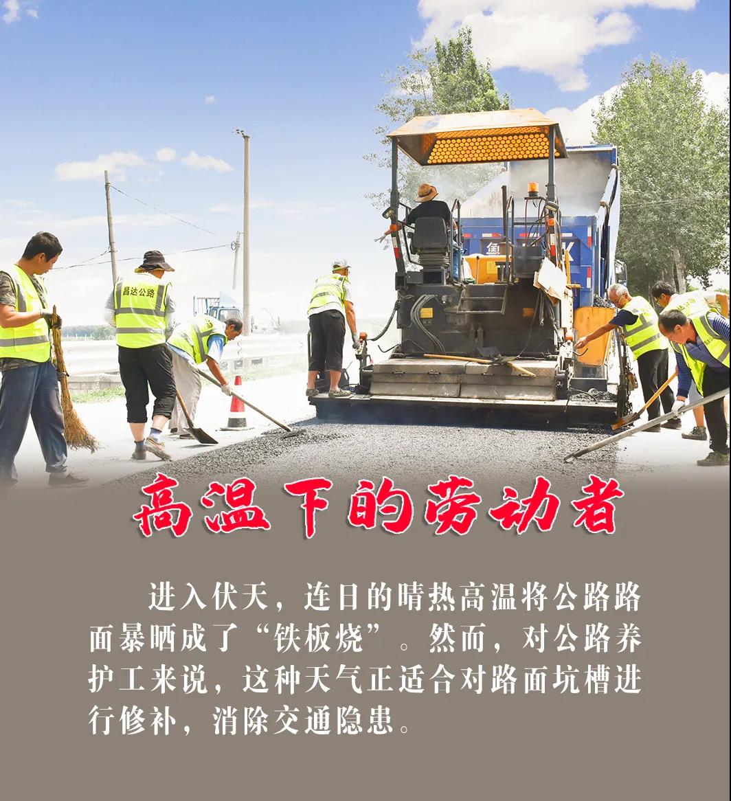 “反光背心里的衣服基本从开始干活到下班就没有干透的时候,太热的时候遮阳的草帽也带不住。”为保证工程进度,负责沥青路面摊铺的工人每天要在这种高温路面上工作近10小时。公路养护工人们说,能及时排除安全隐患,给过往的车辆提供舒适安全的环境,苦点累点也值得。