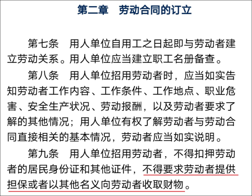 《中华人民共和国劳动合同法》第九条规定,用人单位招用劳动者,不得扣押劳动者的居民身份证和其他证件,不得要求劳动者提供担保或者以其他名义向劳动者收取财物。