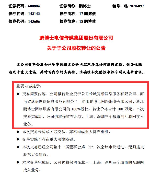 日前,鹏博士发布公告称,公司拟将旗下长城宽带网络服务有限公司、河南省聚信网络信息服务有限公司、沈阳鹏博士网络服务有限公司、浙江鹏博士网络服务有限公司的100%股权转让给中安实业投资(深圳)有限公司。其中,备受关注的长城宽带网络服务有限公司(以下简称“长城宽带”)就在其中,其打包转让价格合计仅为100万元。