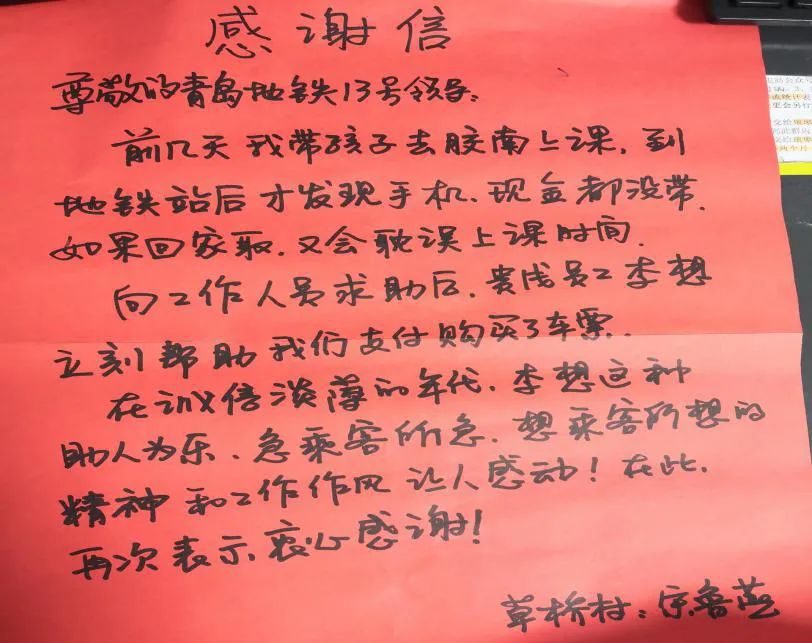 念念不忘,必有回响,几天后,宋女士特意手写了一封感谢信,从草桥村再次前往泊里地铁站,以自己的特殊方式表达了对青岛地铁工作人员的感谢之情!