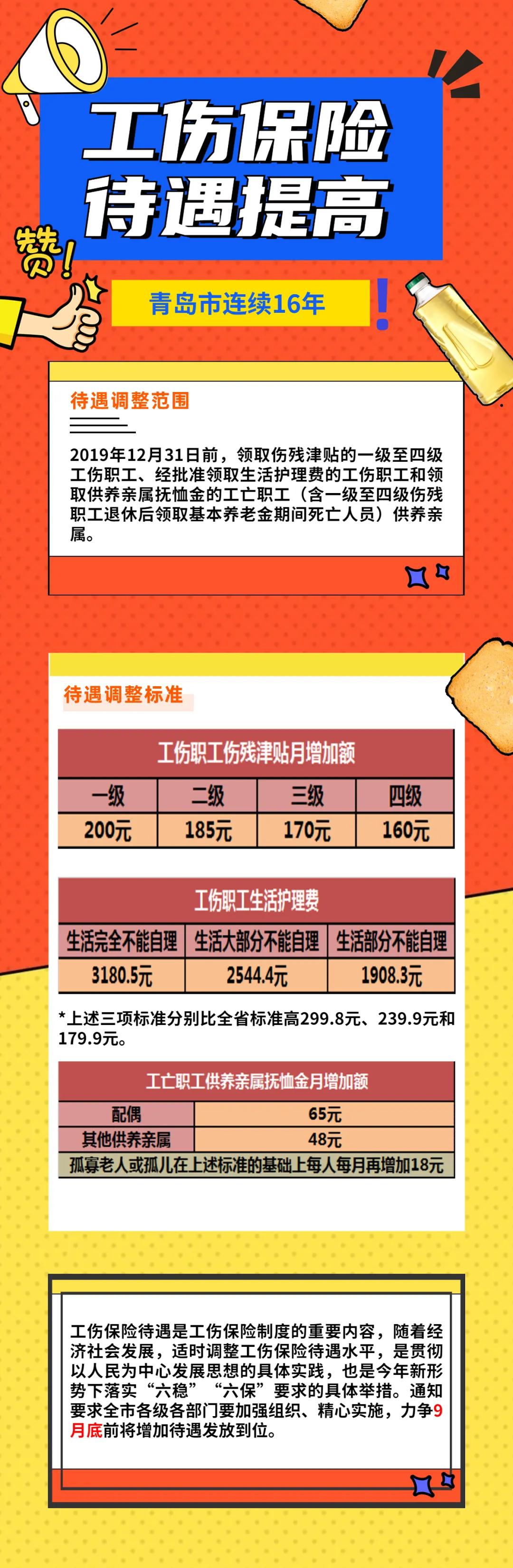 近日,根据省人力资源社会保障厅和省财政厅统一部署,市人力资源社会保障局会同市财政局印发《关于2020年调整一级至四级工伤职工伤残津贴、生活护理费和工亡职工供养亲属抚恤金标准的通知》,自2020年1月1日起,继续提高一级至四级工伤职工伤残津贴、生活护理费和工亡职工供养亲属抚恤金标准。这是我市自2005年起,连续16年提高工伤保险三项定期待遇标准。