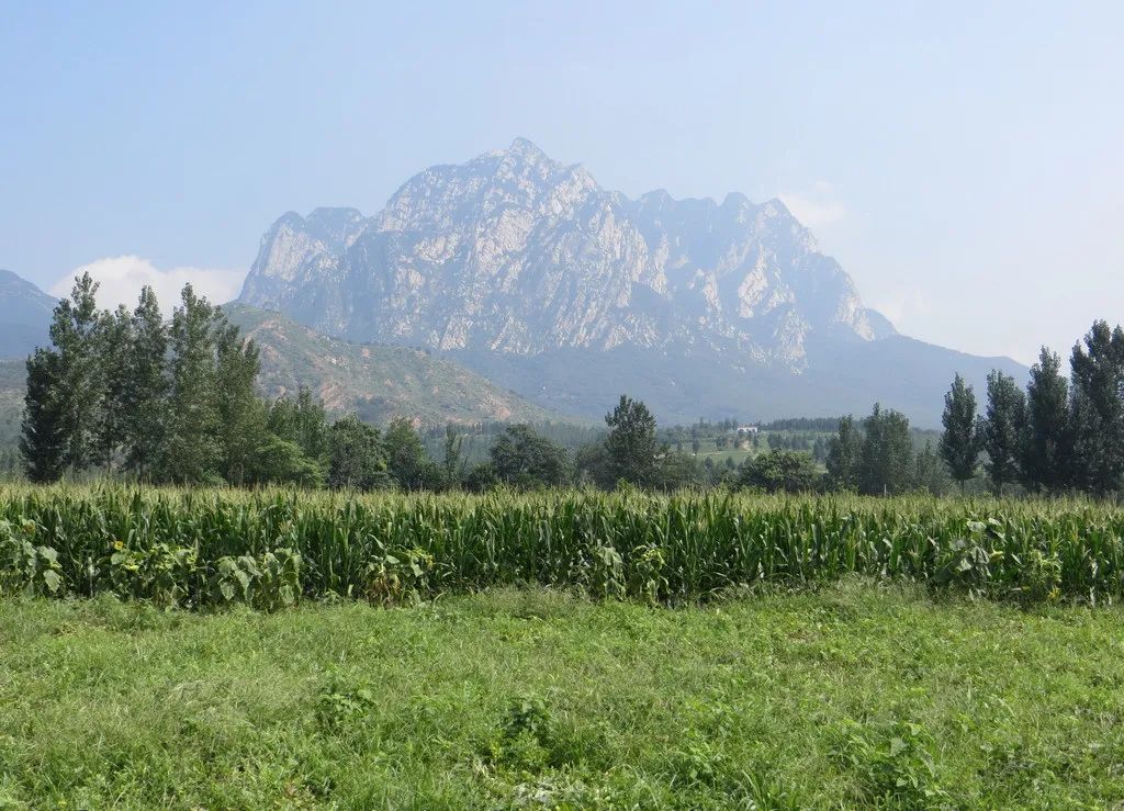 此山因有九座山头,连绵几公里,从山南向北望,一组山峰互相叠压,状如千叶舒莲,一脉相承,故名曰“九顶莲花山”。