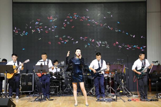 “流淌的歌声”音乐会以现代流行音乐为主,来自青岛演艺集团歌舞剧院的歌手、乐手们以热烈又轻快的曲调营造了轻松愉悦的演出氛围。音乐会由王文娜、李正泽、李晓宁、宋英智等歌手担纲,曲目包含《不忘初心》、《追寻》、《希望的田野》等主旋律作品,也有《知否,知否》、《风的季节》、《皮囊》等流行音乐作品,岛城著名歌手王广镔现场演绎了备受歌迷热爱的《贝加尔湖畔》,还邀请技师学院的两位学生同台演绎这首李健代表作,让全场气氛达到了高潮。演出中,音乐人与现场师生密切互动,主持人还把现代电声乐队的各个乐器介绍给乐迷。最后,音乐会在全体演员齐唱《我和我的祖国》声中结束,为这场充满了正能量和现代气息的音乐会画上圆满句号。