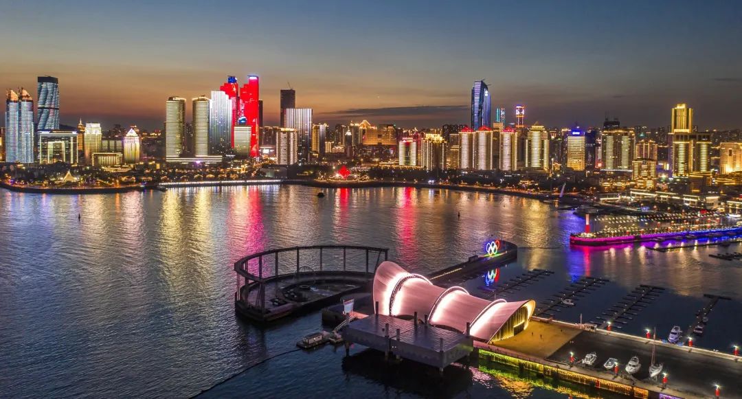 到达浮山湾灯光秀最佳观赏地——奥帆中心,掠过水面看灯光点点。