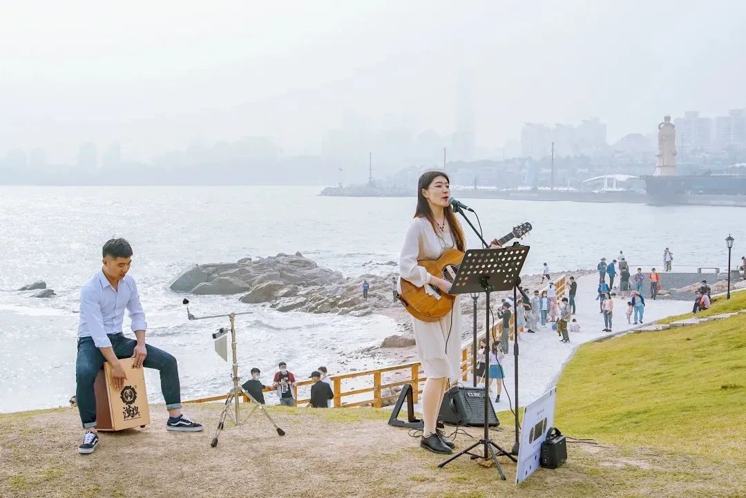 白云悠悠、海水澄澈、微风舒爽、海浪轻柔,小麦岛的一切温柔且治愈。在小麦岛西坡的草坪上,伴着浪声,迎着夕阳,一群喜欢民谣热爱音乐的年轻人——小篷车乐队,唱着自己的旋律,用吉他诉说简单且纯粹的故事。希望落日前的歌声和落日后的舞会,可以给大家带来一点温暖。