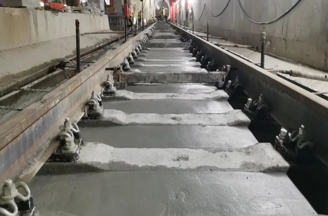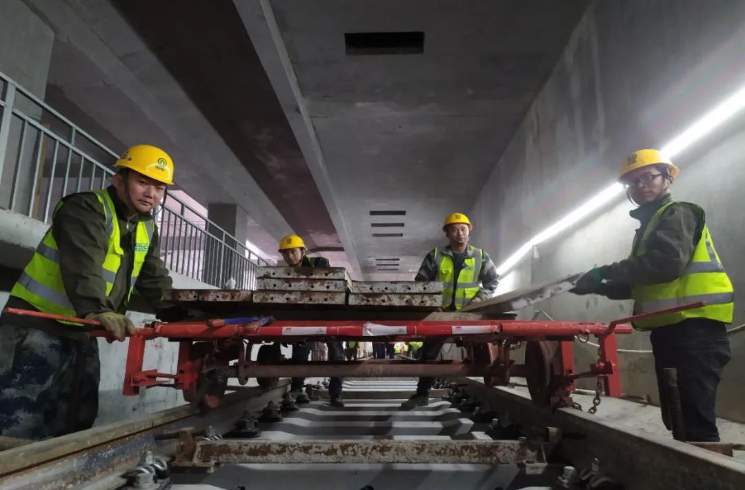 胜利桥站左线铺轨施工 青岛站至青岛北站位于青岛市中心城区繁华地段,人口密集,轨道施工的基地场地有限、材料运输困难。为解决现场面临难题,一号线公司多措并举,有序推进现场施工。一是高位协调土建施工单位积极提供作业面,区间施工以轨道施工为主线,倒排土建工期确定土建施工关键路线,为后续轨道施工创造良好的工作面;二是组织轨道施工单位详细研究施工组织方案,结合土建施工情况,合理安排轨道施工计划,采用“多点施工、同步推进”的施工战略;三是合理利用土建施工竖井等现场下料口,通过机械铺轨基地和人工铺轨基地结合的方式,优化铺轨方案,保障工期目标。
