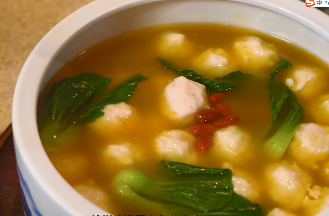 最后把金汤倒入锅内,加入飞过水的青菜和枸杞进行点缀,这道汤鲜味美的金汤墨鱼丸就OK啦~