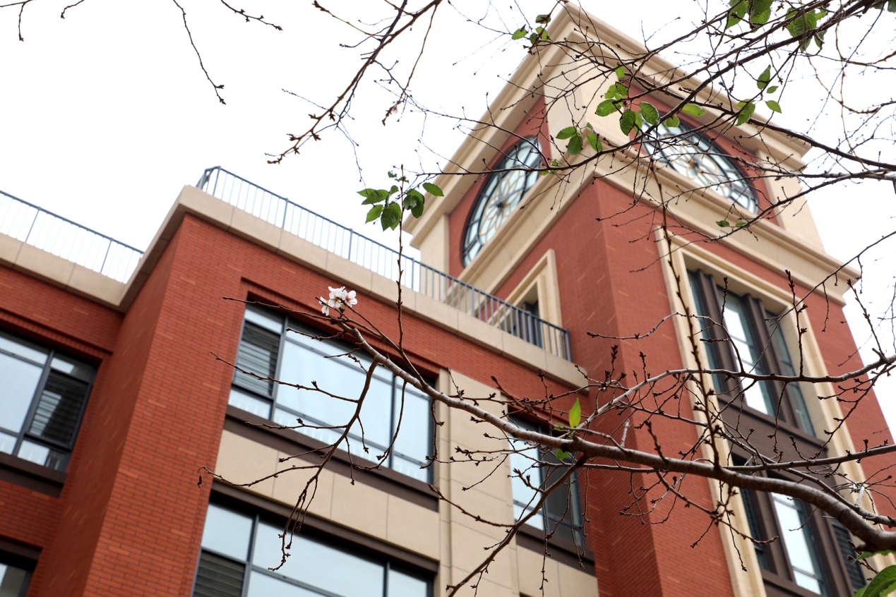 海信学校钟楼下,一束樱花“逆龄”开放,诉说着秋日的美好。