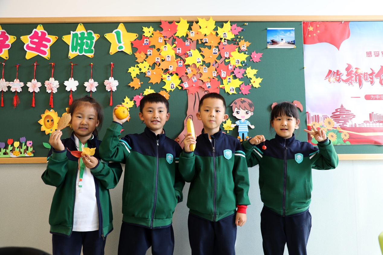 海信学校教室,一年级(2)班的学生知秋感秋,秋天有金灿灿的橘子,香甜可口的香蕉……还有可爱的我们。
