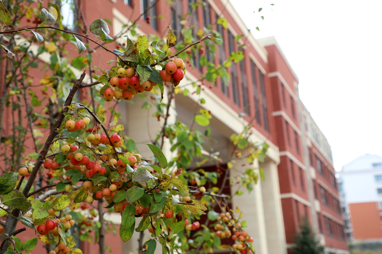 海信学校教学楼前,硕果累累,颗粒圆润,喜在眉梢。