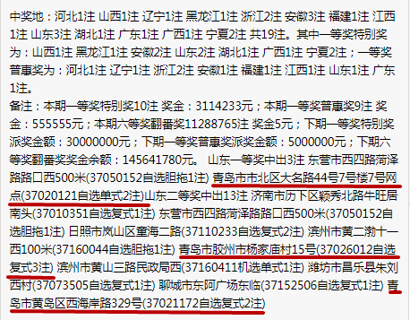 11月22日晚,中国福利彩票双色球游第2020117期开奖,这是今年双色球12亿元大派奖活动第七期派奖。当期双色球红球号码为07、08、09、10、16、27,蓝球号码为07。10注一等奖特别奖887万多元,六等奖翻番奖1128万多注,当期双色球头奖19注,其中10注为一等奖特别奖,单注奖金为887万多元(含派奖311万多元)。这10注一等奖特别奖花落7地,山西1注,黑龙江1注,安徽2注,山东2注,湖北1注,广西1注,宁夏2注;另外9注为一等奖普惠奖,单注奖金为631万多元(含派奖55万多元)这9注一等奖普惠奖花落8地河北1注,辽宁1注,浙江2注,安徽1注,福建1注,江西1注,山东1注,广东1注。当期二等奖开出225注,单注金额8万多元,其中山东的两注一等奖特别奖被青岛彩民斩获。这2注一等奖出自一张投注额20元的自选单式(2倍)彩票对5注号码分别进行2倍投注,幸运中得2注一等奖来自市北区大名路44号7号楼7号网点,福彩37020121销售站。