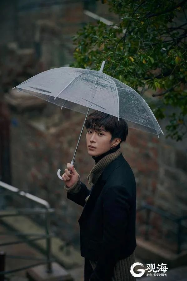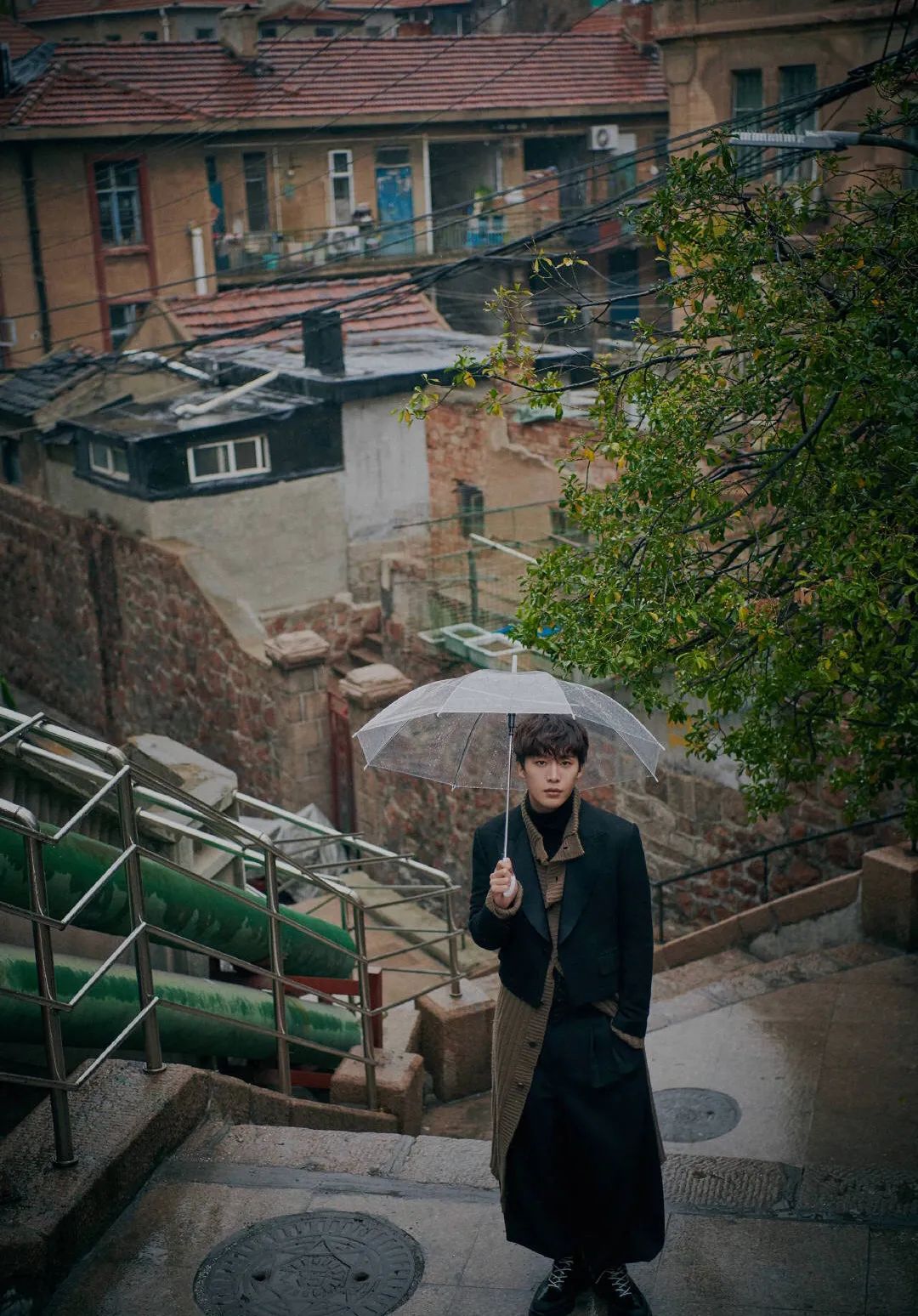 照片中幽静唯美的小路配上手持雨伞的少年,