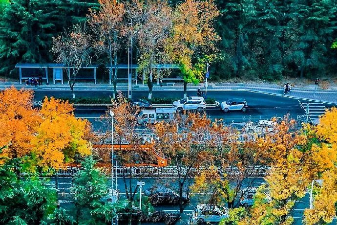 当秋天来临,天高气爽,秋意盎然,城阳区有轨电车线行车道两侧的树木浸染了秋意。