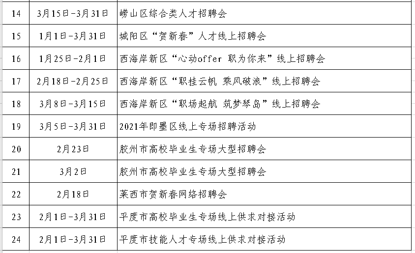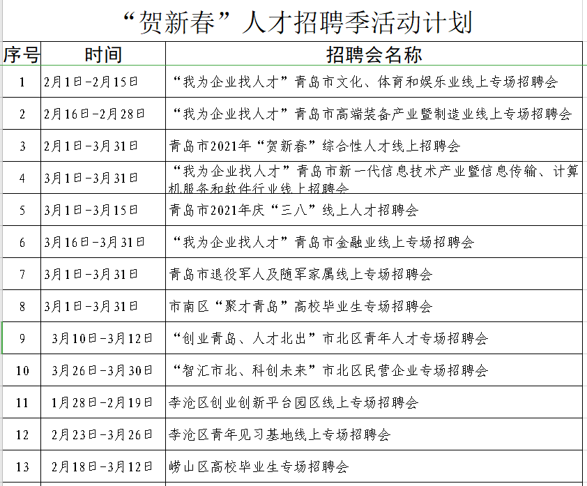 据了解,本次“贺新春”人才招聘季将在青岛人才网和中国海洋人才市场(山东)线上线下同步开展,截至目前,青岛人才网已发起24场分专业、分领域各具特色的线上招聘活动,招聘季将一直持续到3月31日,已吸引包括青岛日报、澳柯玛、海尔等227家企事业单位报名参会,涉及信息技术、机械制造、生物医疗、商贸服务等诸多专业领域。