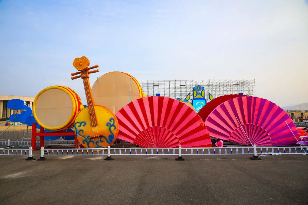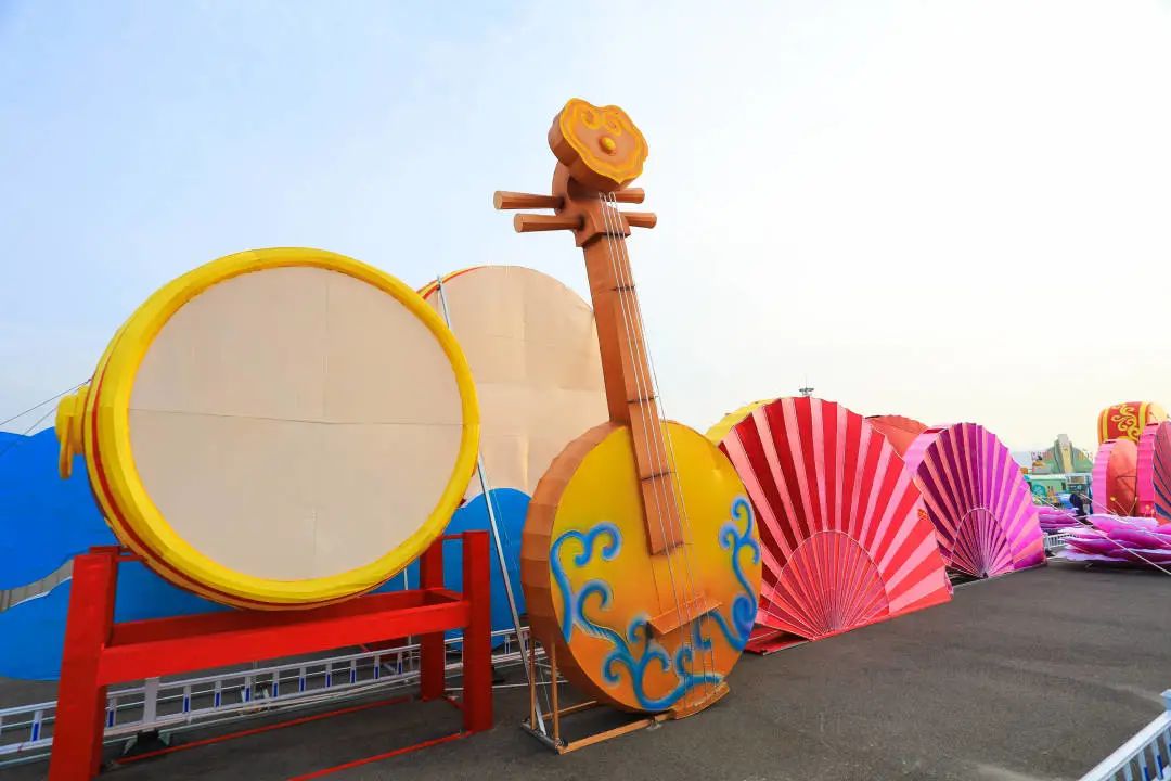“华灯初上”为花鼓折扇造型灯组,