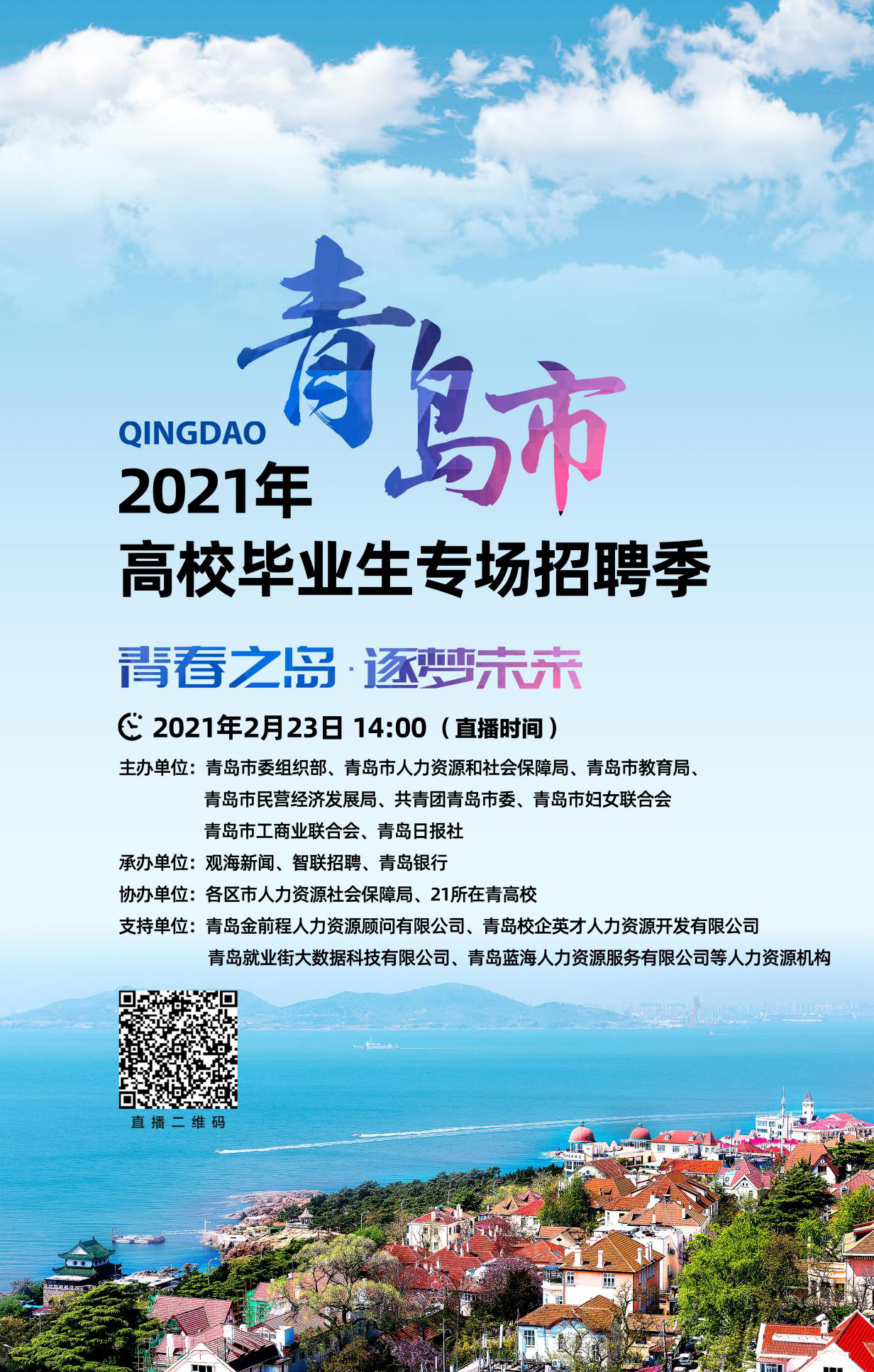 青岛新闻网2月22日讯 就业云招聘,春招正当时。为帮助用人单位和高校毕业生搭建对接交流平台,实现岗位精准匹配,吸引青年人才聚青创新创业。青岛市委组织部、青岛市人力资源和社会保障局、青岛市教育局、青岛市民营经济发展局、共青团青岛市委、青岛市教育局、青岛市妇女联合会、青岛市工商业联合会,联合青岛日报社观海新闻、智联招聘以及金前程、校企英才、就业街、蓝海人力等人力资源机构举办的“青春之岛·逐梦未来”2021年青岛市高校毕业生专场招聘季活动将于2021年2月23日下午14:00正式启动,政策推介、局长代言、形势分析,岗位发布,统统给你安排。目前已面向全市收集2062家企业发布的招聘岗位72160个,所有招聘岗位均为月薪5000元以上。