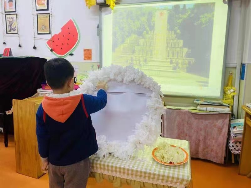 为增强幼儿的爱国主义和革命传统教育,让幼儿了解到今天的幸福生活是无数革命先烈用生命和鲜血换来的,中班级部的孩子们决定亲手做出美丽的花圈送给为国牺牲的革命先烈们。孩子们聚精会神地跟着老师学剪花圈,折纸花,粘贴花朵。制作完成后孩子们心怀对烈士深深的敬意,在老师的带领下把花圈献给我们的英雄,以祭奠英烈之魂。