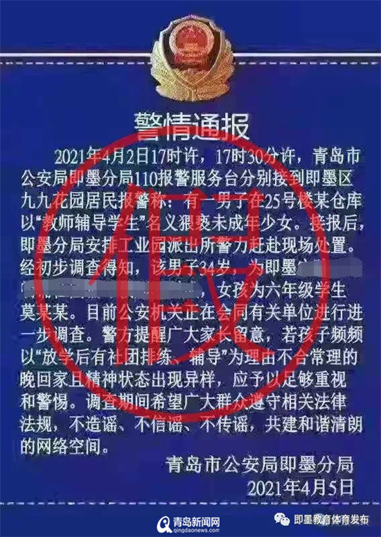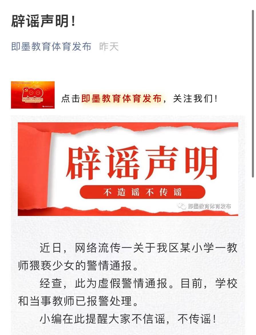青岛新闻网4月7日讯(记者 丁淑华)近日,网上流传一则即墨公安局警情通报,通报中提到一男子在某小区仓库以“辅导学生”名义猥亵未成年少女。对此即墨教育体育官方公众号发布辟谣声明,网络流传某小学教师猥亵少女的警情通报为虚假警情通报,目前学校和当事教师已报警处理,并提醒网友不信谣,不传谣。
