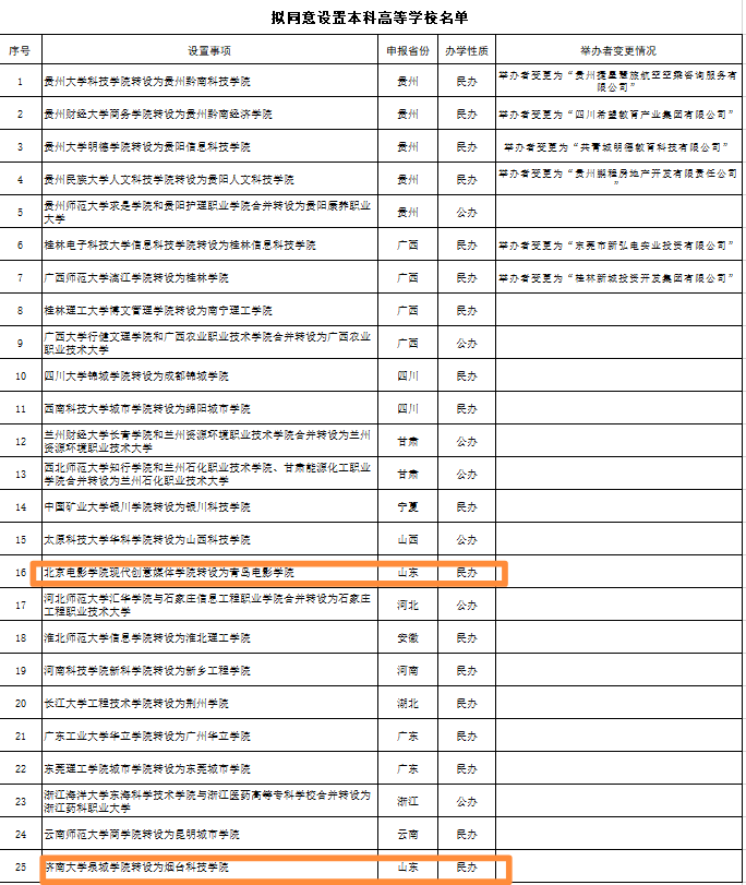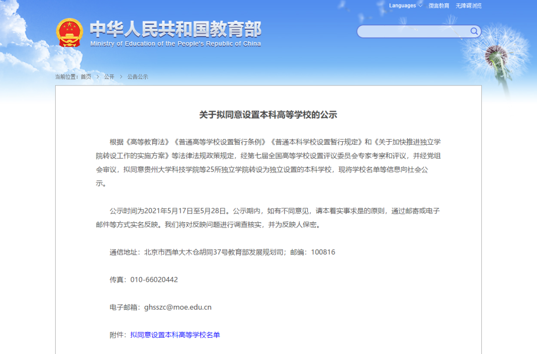 根据《高等教育法》《普通高等学校设置暂行条例》《普通本科学校设置暂行规定》和《关于加快推进独立学院转设工作的实施方案》等法律法规政策规定,经第七届全国高等学校设置评议委员会专家考察和评议,并经党组会审议,拟同意贵州大学科技学院等25所独立学院转设为独立设置的本科学校,现将学校名单等信息向社会公示。
