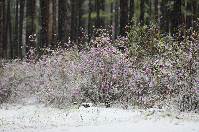 黑龙江漠河五月飞雪 杜鹃花雪下盛开