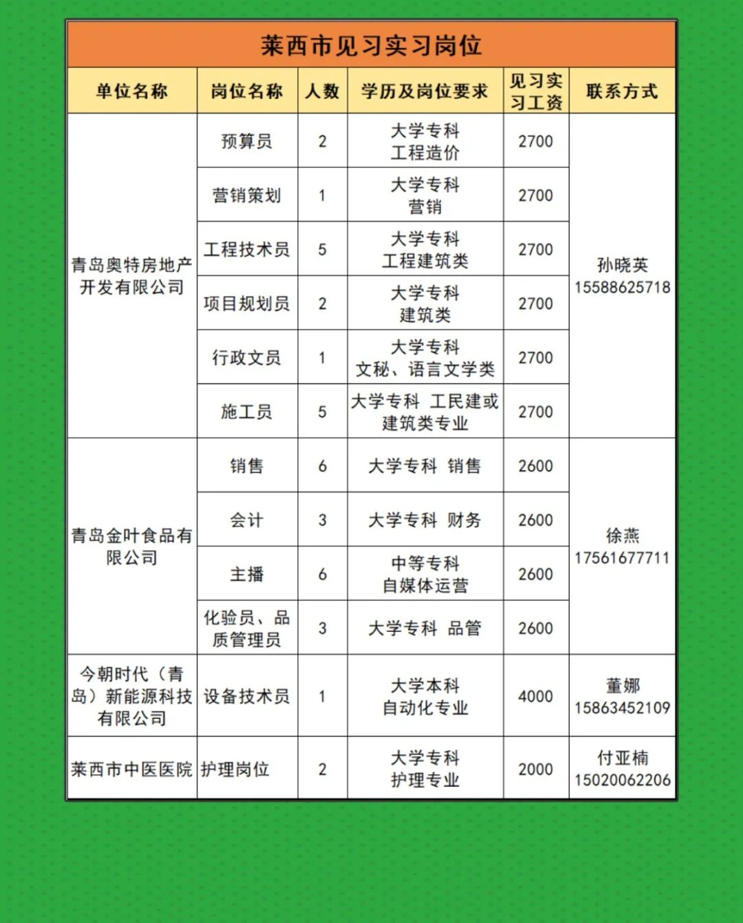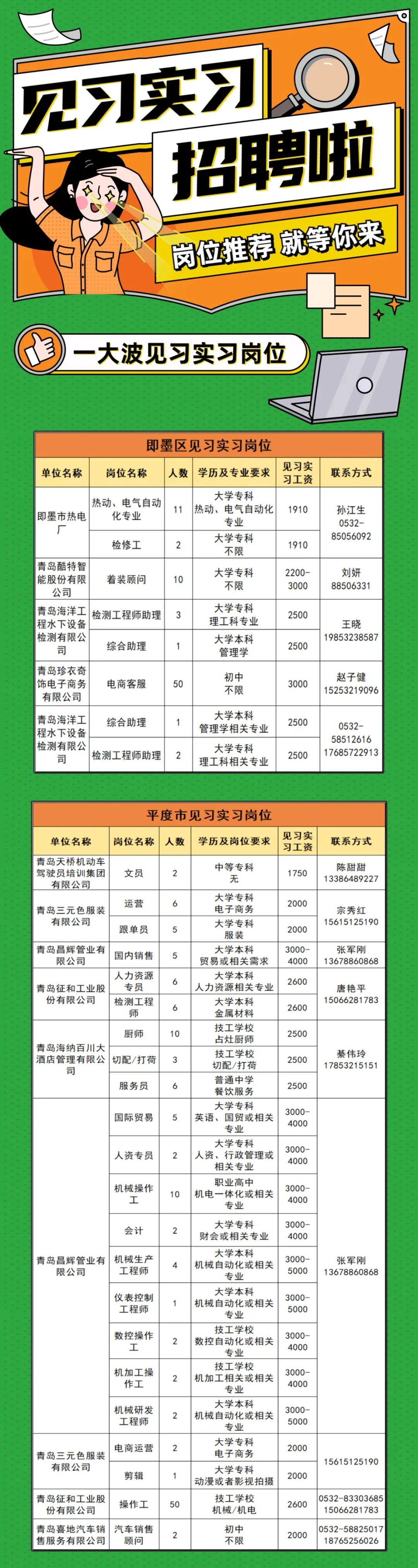 即墨区、平度市、莱西市见习实习岗位推荐来啦!
