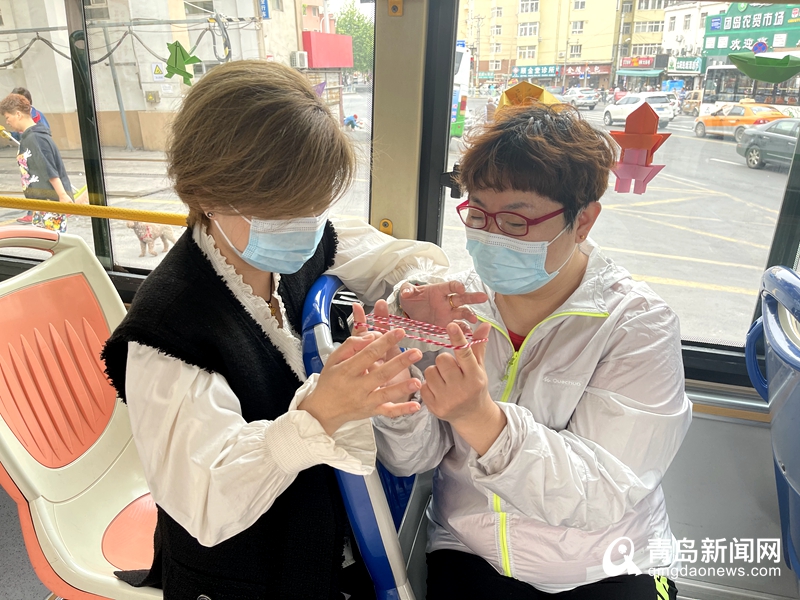 上午9时许,驾驶员曹玮发车,同车乘客冷女士和孔女士被车厢内的小物品吸引,两人同时看到了一根五颜六色的棉线,冷女士拿起棉线熟练的翻起花样,孔女士也不禁“接招”,几个回合之后,两人面对着手中杂乱的棉线不约而同笑了。