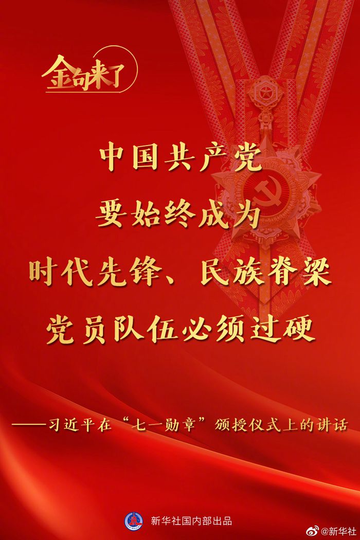 习近平说,新时代是需要英雄并一定能够产生英雄的时代。中国共产党要始终成为时代先锋、民族脊梁,党员队伍必须过硬。希望受到表彰的同志珍惜荣誉、发扬成绩,争取更大光荣。各级党组织要从工作和生活上关心爱护功勋党员,大力宣传“七一勋章”获得者的感人事迹和崇高品德,在全党全社会形成崇尚先进、见贤思齐的浓厚氛围,激励广大党员、干部牢记党的性质宗旨,牢记党的初心使命,不懈奋斗,永远奋斗,在全面建设社会主义现代化国家新征程上,向着第二个百年奋斗目标、向着中华民族伟大复兴的中国梦奋勇前进!