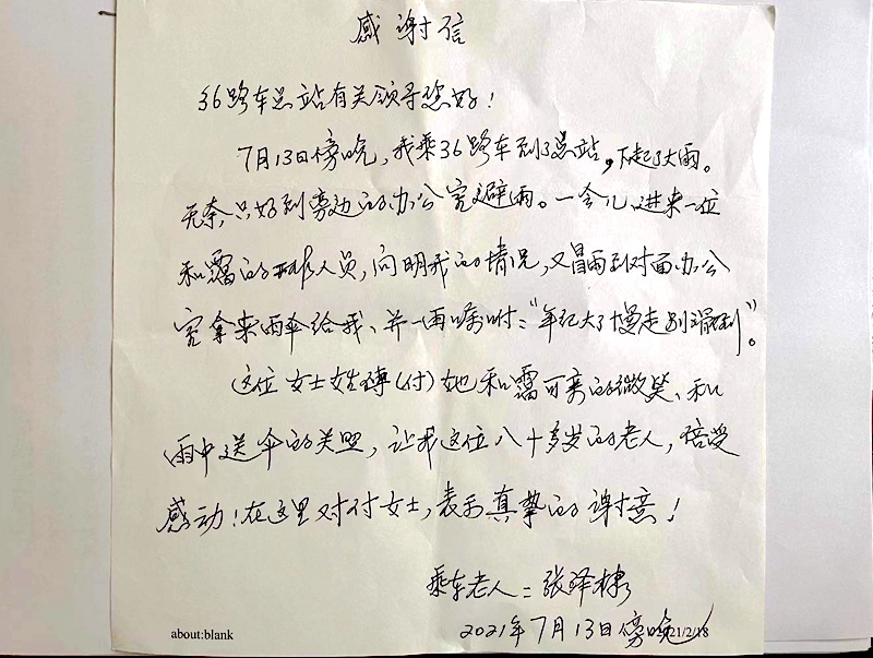 为信守还伞的承诺,并尽早送上感谢信,当日傍晚6点半左右,老人竟再次冒雨来到场站。“当时,雨下得很大,老人身上被风刮得到处是雨水,我看了很心疼。”接待老人的调度员王彩霞回忆,对方一边说明来意,一边递上雨伞和信件,并表示一定要她代为转达谢意。“我跟老人说不用特意跑一趟,但她说怕耽误付姐下班用伞,必须要及时送还,我听了特别感动。”随后,王彩霞叮嘱老人谨慎慢行、注意安全,并告知付海霞其送伞一事。