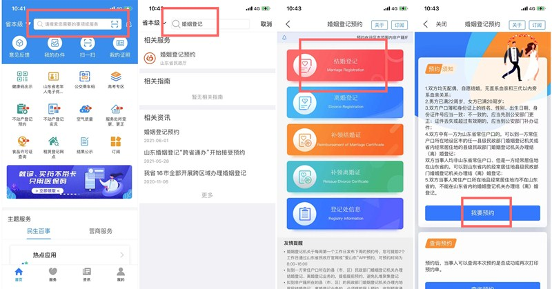 “爱山东”APP上线“婚姻登记预约”服务,只要准新人双方中有一位是山东户籍内地居民,便可在“爱山东”APP上选择省内户籍所在地县级民政部门婚姻登记机关,提交结婚登记预约申请,提前拿到“婚姻号码牌”。