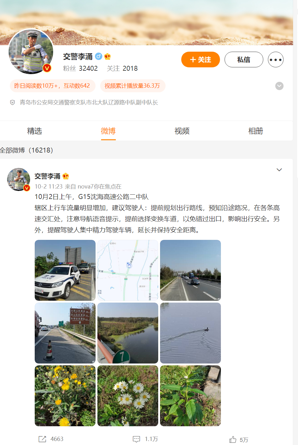 10月8日,公安部举行新闻发布会,通报国庆假期社会治安秩序等相关情况。公安部新闻发言人张明说,“山东青岛交警李涌10月3日凌晨在查处酒驾的执法中不幸牺牲。”她介绍,10月1日10时零1分,李涌还在卡点发布微博为祖国庆生。李涌的微博账号至今共发布了16218条微博,大多是交管服务信息和交通安全知识。他的最后一条微博于10月2日发布,通报辖区高速公路最新路况,提示行车安全。李涌牺牲后,短短一天内,他的粉丝新增了8000多人,且数据仍在增加,“人民群众正是用这种令人泪目的方式缅怀逝去的英雄。”