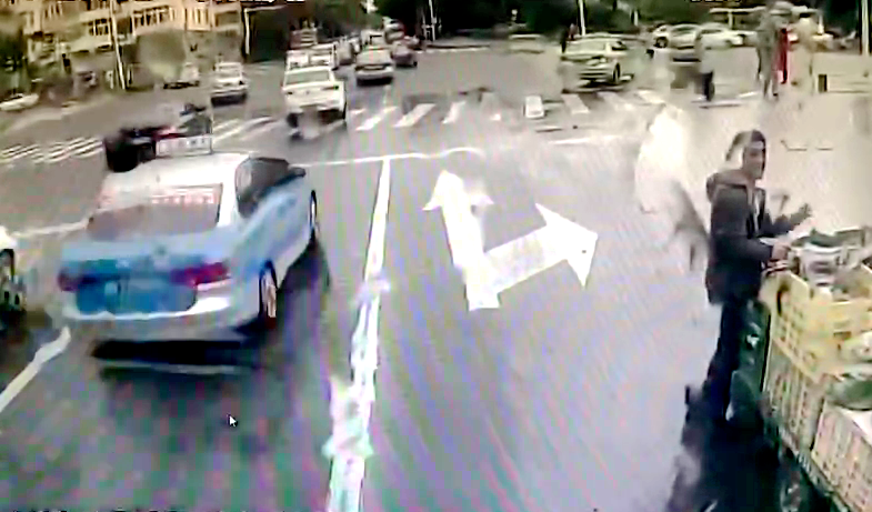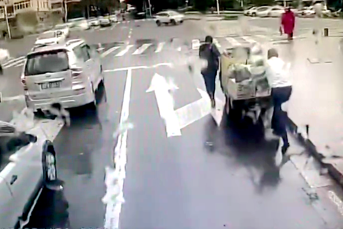 10月9日上午,谭海东像往常一样驾驶车辆在晓翁村站点上下客完毕后,观察路况准备出站。“出站时,我发现前方路段拥堵,车辆纷纷缓行变道,肯定是发生了什么事情。”谭海东回忆,驾车行至近处,他看到一辆三轮车停靠在直行兼右转车道上,车主正扶车紧靠路边避让。“车道本就不宽,三轮车即便避让,我驾车也难以通过。”谭海东说,见此情况,他立即下车查看情况。经与车主交流,他得知三轮车因突然没电只能停在路边,而该处为上坡路段,天下着细雨,仅凭对方一人难以将车挪走。此时,红灯恰好亮起,他当即决定出手相助。二人一前一后,车主把住车头控制方向,谭海东则在车尾处弯腰弓身全力推车,以最快速度将车推至路中绿化带处。“绿化带附近的路面较平,车流驻停后,车主再推车就很容易了。”