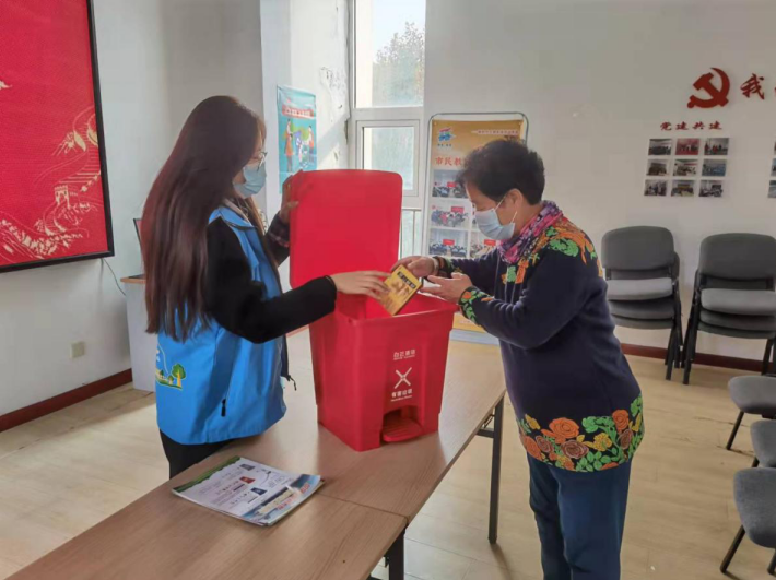 活动开始,工作人员向居民讲解了有害垃圾对环境的危害性、有害垃圾的主要种类以及有害垃圾该如何处理。随后,志愿者向居民发放宣传单页,并向居民介绍了青岛目前实行的四分类标准。工作人员的细心讲解吸引了许多居民的参与,居民纷纷拿出家中累积的过期药品、废旧电池、血压计等有害垃圾兑换成实用的纸巾、垃圾袋。