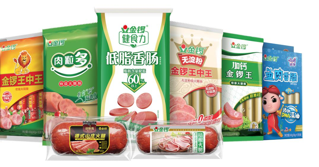 目前,金锣健康肉制品现有产品涵盖高、中、低温肉制品和休闲肉制品等,包括中温突破型产品“肉粒多”、高温换代型产品“无淀粉王中王”,以及健康创新产品“健食力”、德式低温产品“德斯克”、休闲第一品牌“得乐食”和儿童专属产品“哈啰伙伴”等多种健康的差异化产品,品项达500余种,品牌的健康形象深入人心。
