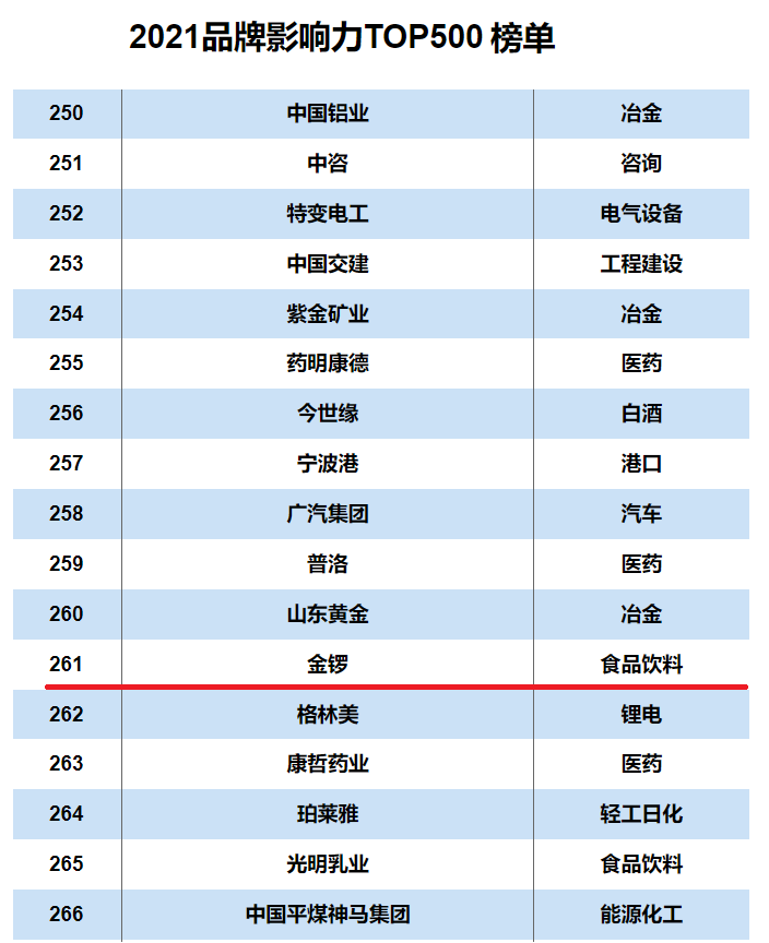 金锣上榜2021品牌影响力Top500榜单